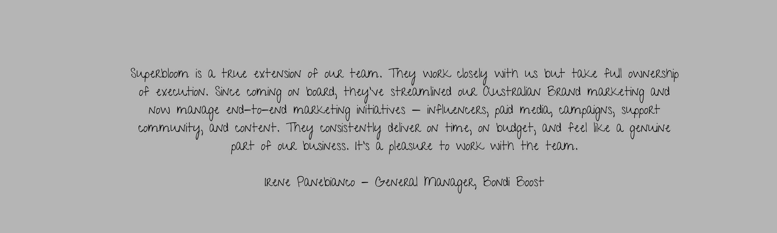Superbloom is Bondi Boost's strategic head of brand marketing for Australia. We own the entire Australian brand presence — from strategy and community building to PR, influencer partnerships, events, content production, and retail support.
